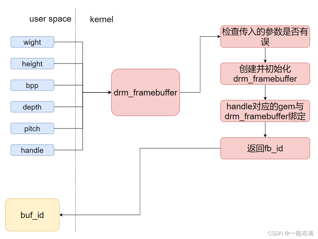 gem obj创建之后需要与一块drm_framebuffer进行绑定使用,因为最终刷图使用的是fb。使用下面接口会创建drm_framebuffer并与上节创建的gem obj进行绑定。