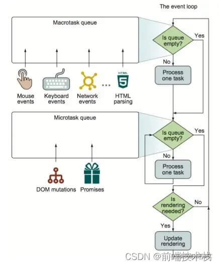 然后再从宏任务队列中取下一个,执行完毕后,再次将 microtask queue 中的全部取出,循环往复,直到两个 queue 中的任务都取完。