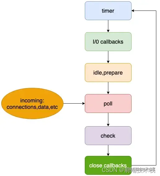 其中libuv引擎中的事件循环分为 6 个阶段,它们会按照顺序反复运行。每当进入某一个阶段的时候,都会从对应的回调队列中取出函数去执行。当队列为空或者执行的回调函数数量到达系统设定的阈值,就会进入下一阶段。下面是Eventloop 事件循环的流程: