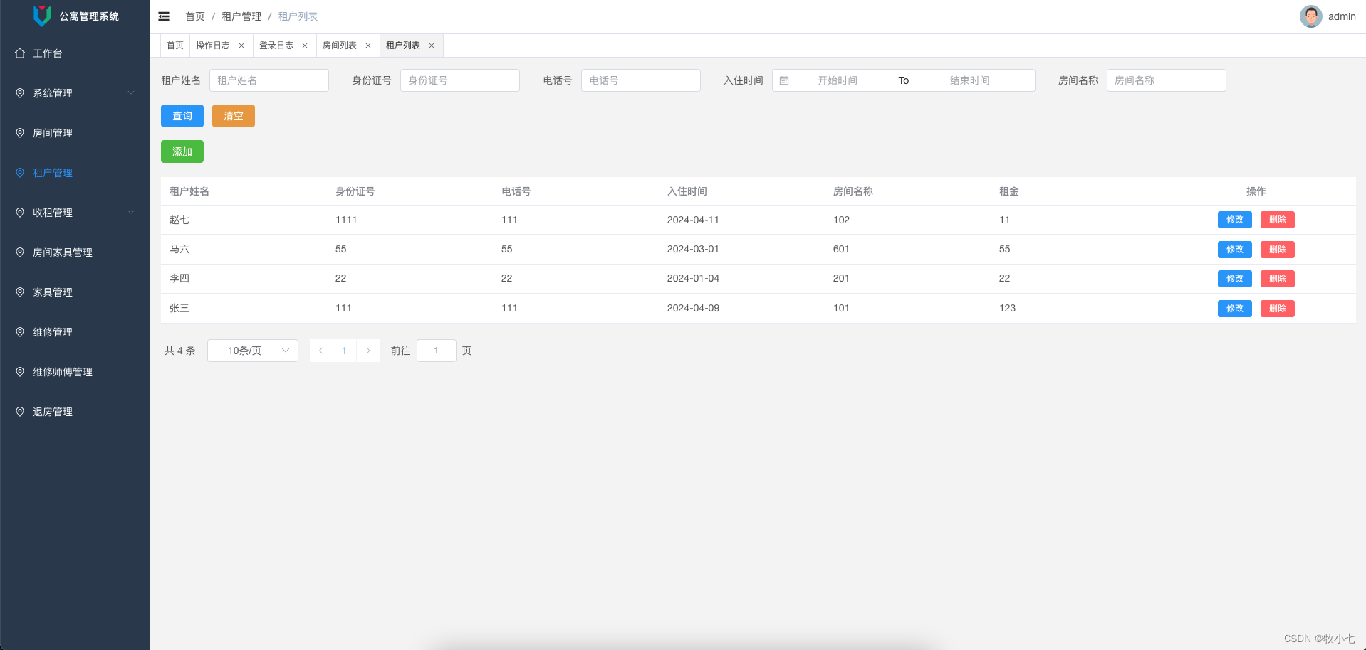 项目介绍 公寓管理系统可以帮助公寓管理员更方便的进行管理房屋。功能包括系统管理、房间管理、租户管理、收租管理、房间家具管理、家具管理、维修管理、维修师傅管理、退房管理。 功能介绍 系统管理 用户管理 对系统管理员进行管理,新增管理员,修改…...