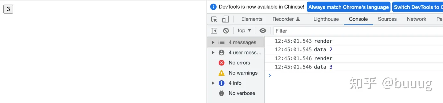 在react 17.x下, 我们能够同步的获取到data的值, 所以输出会是2, 3.同时也会经历两次react的整个render过程, 所以也会导致render被打印两次, 这都是因为setTimeout带来的影响, 具体的解释可以参考之前的文章.
