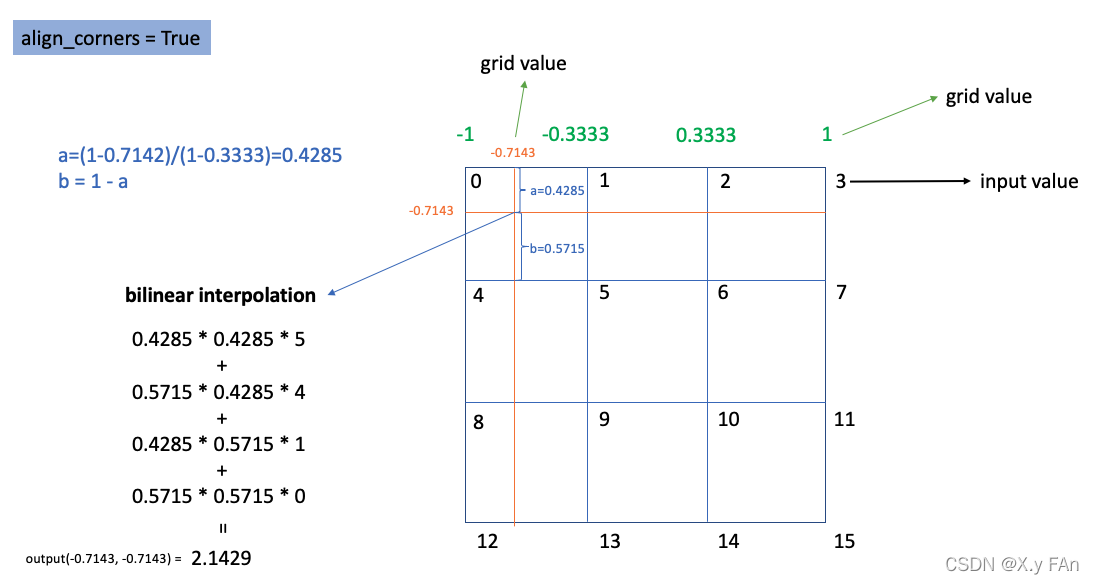 当align_corners=True时,input四个角落的坐标值,被映射为坐标系范围的四个角上。于是坐标(-1, -1)的值为0,(1, 1)的值为15。
