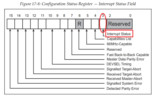 - 位于PCI配置空间状态寄存器(Status Register) 的Bit 3(只读)。