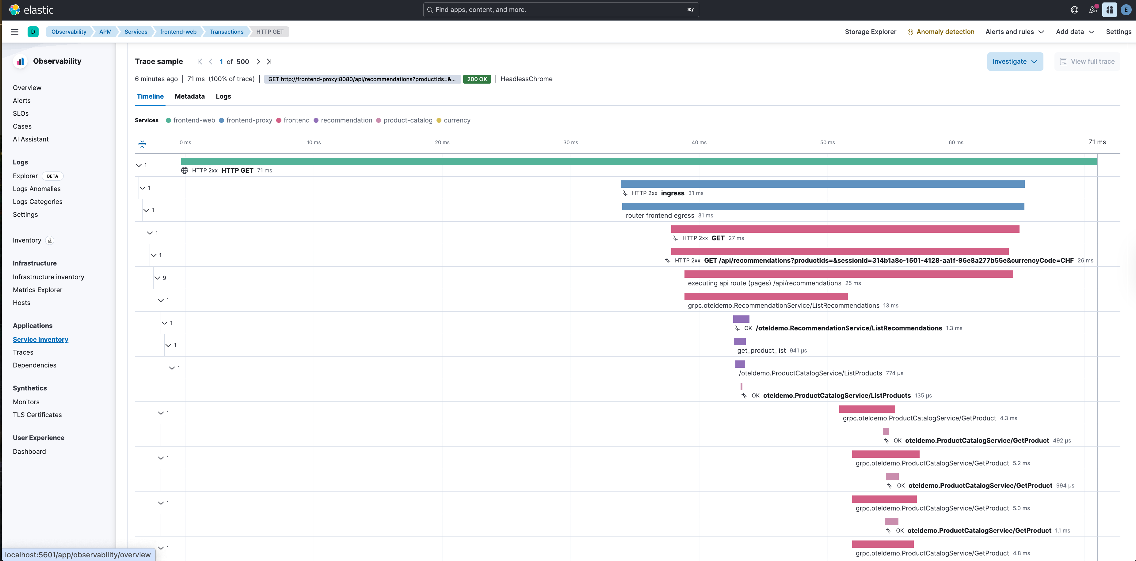 Elastic 提供了 OpenTelemetry Demo 的 Elastic Observability 版本,该版本使用了 Elastic Distributions of OpenTelemetry (EDOT) 来为应用程序进行插桩。Elastic Distributions of OpenTelemetry(EDOT) 是为 Elastic 量身打造的 OpenTelemetry 开源发行版生态,包含定制化的 OpenTelemetry Collector 和多个 OpenTelemetry 语言 SDK。
