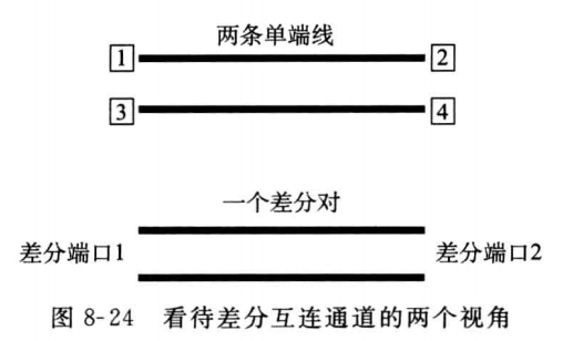 由于差分互连中使用差分信号传递信息,接收器最关心的是差分信号的质量,如果互连通道的S参数能直接反映出对差分信号的影响,对分析问题将方便得多。差分互连通道可以看成是一个四端口网络,激励源为单端信号,此时得到的S参数就是常见的测量得到的S参数,即单端S参数。另一方面,从差分信号角度来说,差分互连通道也可以看成是一个二端口网络,但激励源有差分信号和共模信号两种信号,这时得到的就是差分S参数,也称混合模态S参数(mixed-mode scatter parameter)。图8-24展示了看待差分互连通道的两个视角。