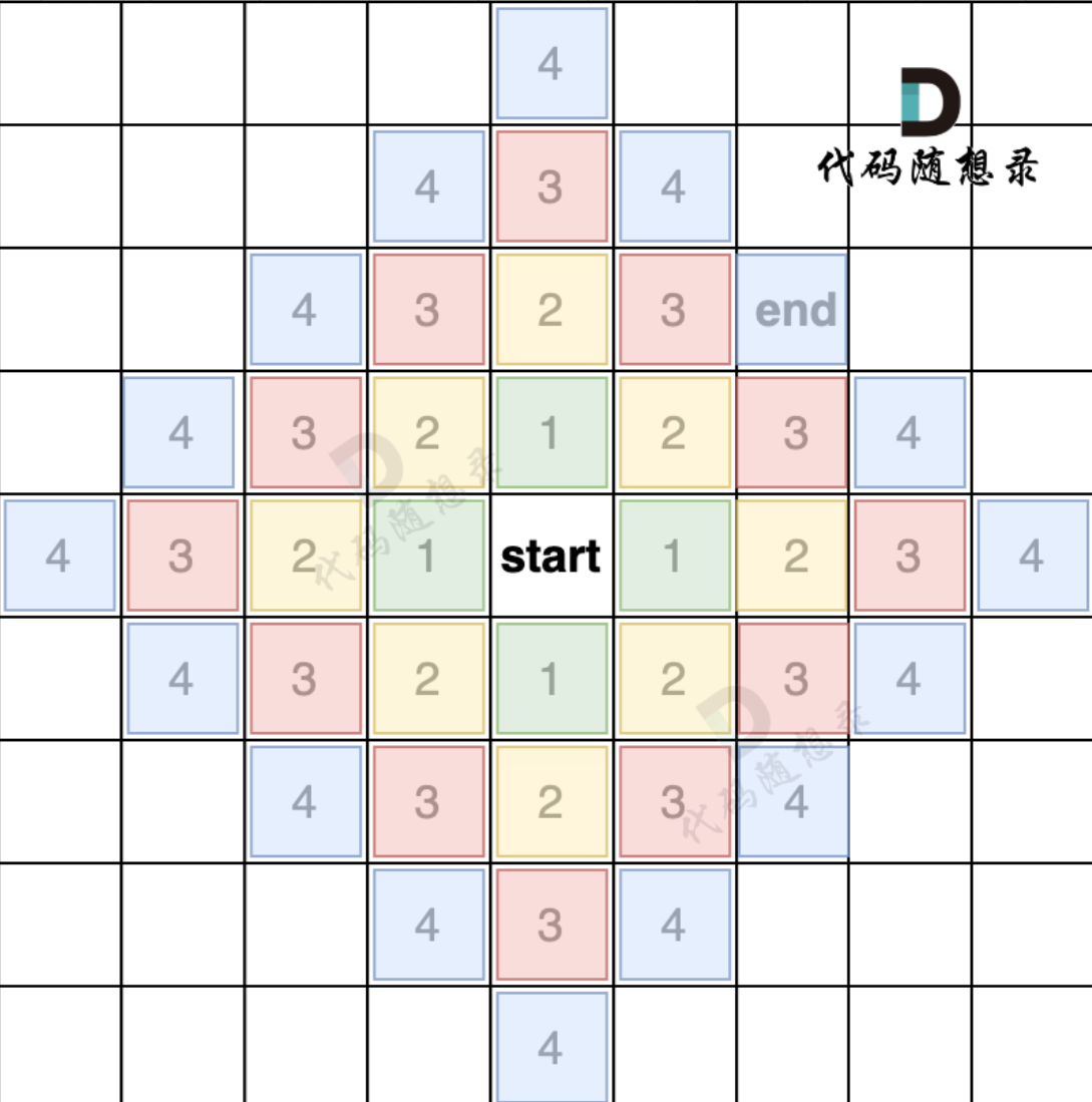 其实大家可以很清楚看到我们是一圈一圈来搜索的,接下来我们来看代码框架,我们可以考虑使用队列,因为考虑到队列先进先出的特性我们不需要一圈逆时针一圈顺时针,如果我们使用栈的话,我们就必须一圈顺时针一圈逆时针,有时候很容易出错,