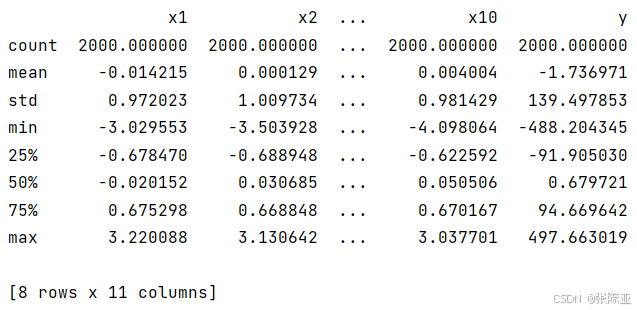 通过Pandas工具的describe()方法来查看数据的平均值、标准差、最小值、分位数、最大值。