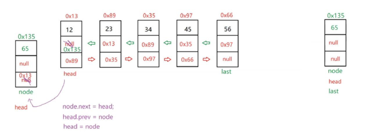 @Overridepublic void addFirst(int data) {ListNode node = new ListNode(data);if (head == null) {head = last = node;}else {node.next = head;head.prev = node;head = node;}}
