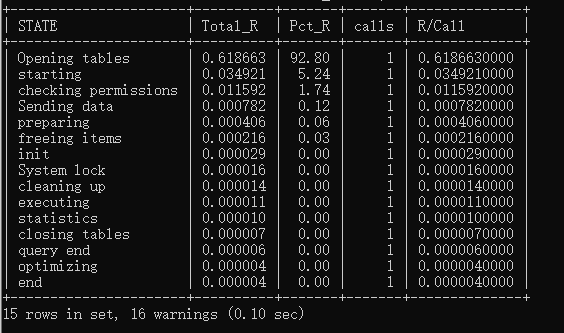STATE:表示查询执行的不同阶段或状态。Total_R:表示每个状态下花费的总时间(单位通常是秒)。Pct_R:表示每个状态下花费的时间占整个查询总时间的百分比。calls:表示每个状态被调用的次数。R/Call:表示每次调用该状态所花费的平均时间。