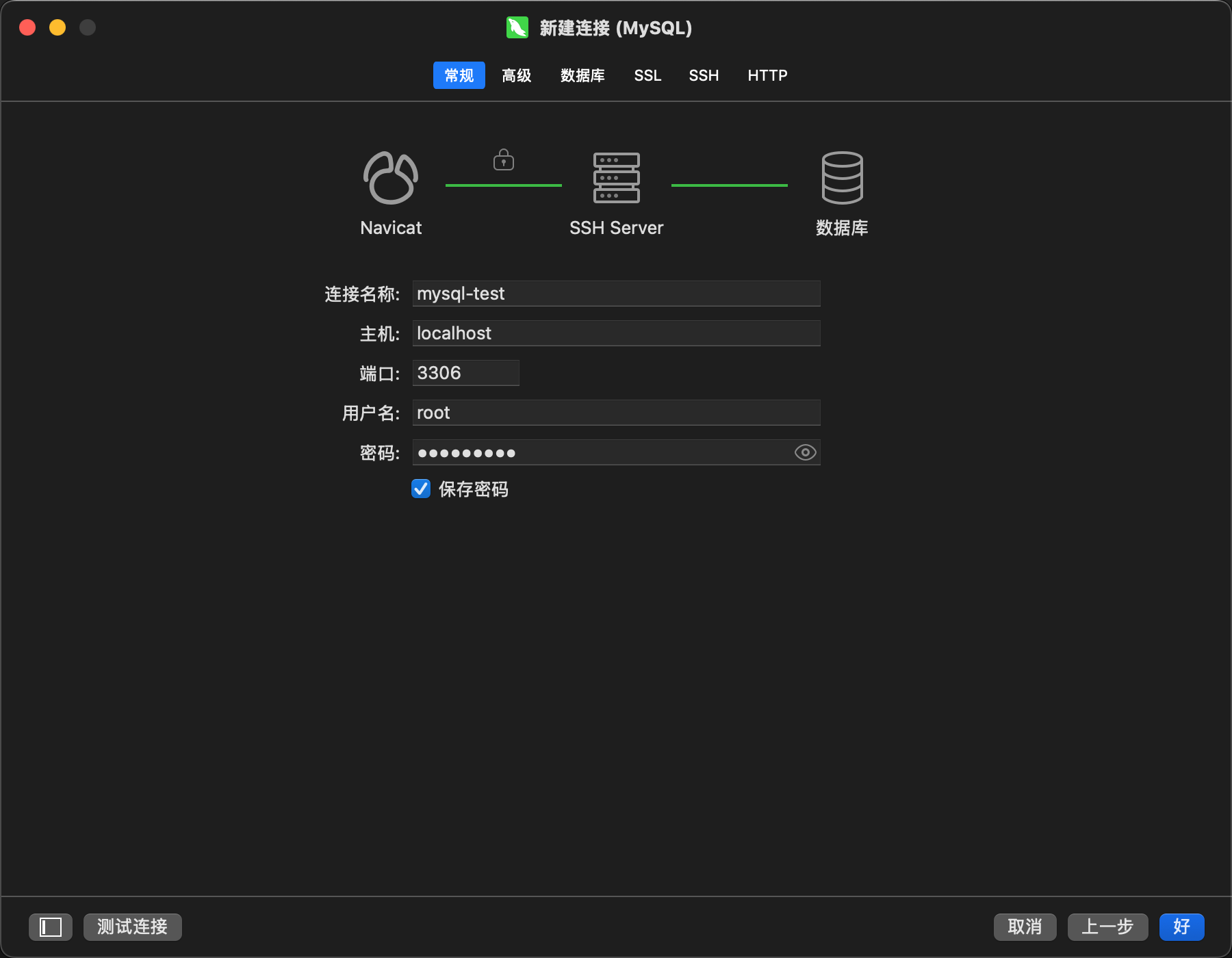 我们在本机打开 Navicat 软件,新建 Mysql 连接,打开如下图的面板:
