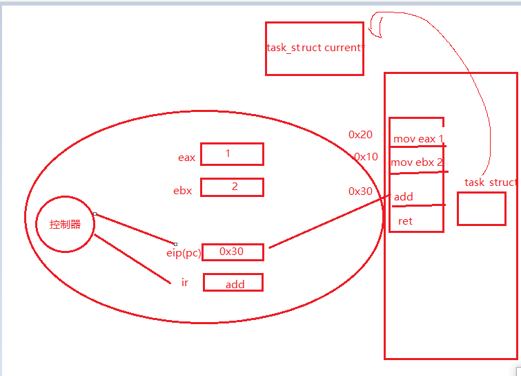 有了优先级就是为了在进程切换的时候进行排序,那么什么是进程切换?进程切换的核心其实就是保存上下文数据恢复上下文数据,那么什么是上下文数据,容我慢慢叙说。一个进程被被cpu调度的时候,此时它的PCB就是现在调度队列的当前节点,在CPU内部有一套寄存器来储存代码和数据,其中的eip来储存当前执行指令的下一地址,ir存储的是当前需要执行的指令,控制器先ir读指令执行,执行完毕又会反馈给eip寄存器。此时储存在寄存器中的代码和数据就是上下文数据。当前进程的时间片到了即将被切换的时候,它会将上下文数据储存到PCB中的一个tss_struct结构体中,方便下次切换回来的时候能够知道上一次运行到了哪里,恢复寄存器中的数据,每个程序在进程切换的时候都需要做这个事情,因为寄存器只有一套,这种行为是对进程代码数据运行的一种保护,如果不做保护就无法进行调度与切换。