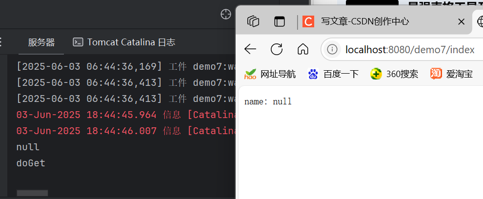 public class IndexServlet extends HttpServlet {@Override//使用这个后 检测到Get方法 会执行相应代码 类似的有doPost等protected void doGet(HttpServletRequest req, HttpServletResponse resp) throws ServletException, IOException {String name = req.getParameter("name");//接收输入的name值PrintWriter out = resp.getWriter();//打印在页面中out.println("name: " + name);System.out.println(name);//打印在调试页面中System.out.println("doGet");//super.doGet(req, resp);}