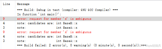 class Derived : public BaseA, public BaseB {};int main() {Derived d1, d2;// d1.x = d2.x; // 编译错误:'x' is ambiguousreturn 0;