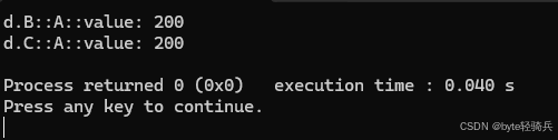 class D : public B, public C {};int main() {D d;d.value = 200; // 无歧义,操作唯一的A实例std::cout << "d.B::A::value: " << d.B::value << std::endl; // 输出200std::cout << "d.C::A::value: " << d.C::value << std::endl; // 输出200(与d.B::value共享同一份数据)return 0;