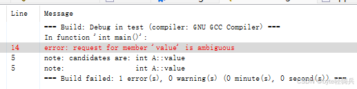 class D : public B, public C {}; // D继承B和Cint main() {D d;// std::cout << d.value << std::endl; // 编译错误:'value' is ambiguous(d.B::A::value 或 d.C::A::value)return 0;