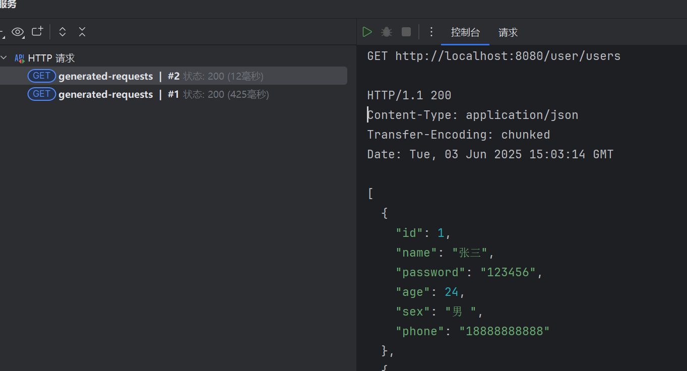 GET请求,输入 URLhttp://localhost:8080/user/users,点击Send发送请求。 - 优势:清晰显示响应状态码、响应头和响应体;支持保存请求历史,方便后续重复测试与接口管理。