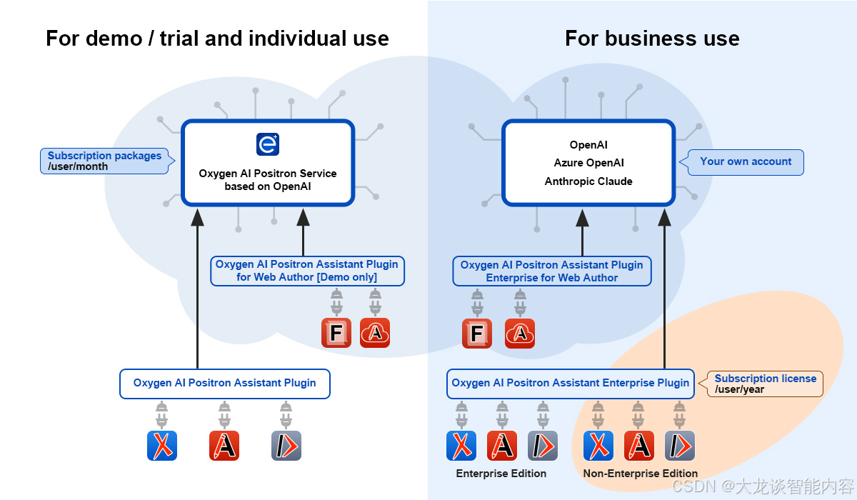 第二个插件Oxygen AI Positron Assistant Enterprise可以连接公有云上的OpenAI chatGPT、企业自己部署在微软Azure云上的chatGPT和Anthropic的Claud大模型。