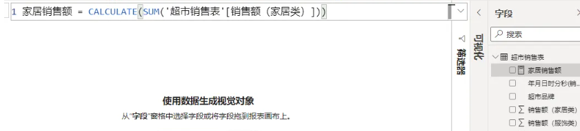 家居销售额 = CALCULATE(SUM('超市销售表'[销售额(家居类)]))