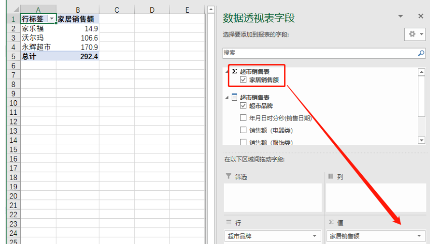 即 数字字段的销售额(家居类)不能放在值区域,如果拖动会有如下提示: