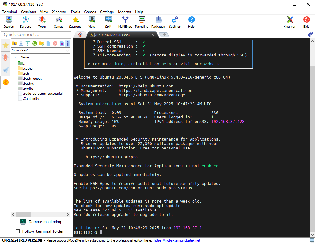 通过百度网盘下载MobaXterm(免安装),并打开,点击Session,选择SSH,输入IP地址和用户名,点击OK