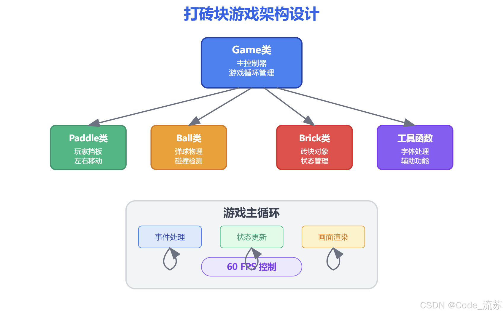 我们的打砖块游戏采用面向对象的设计思路,主要包含以下几个核心类: