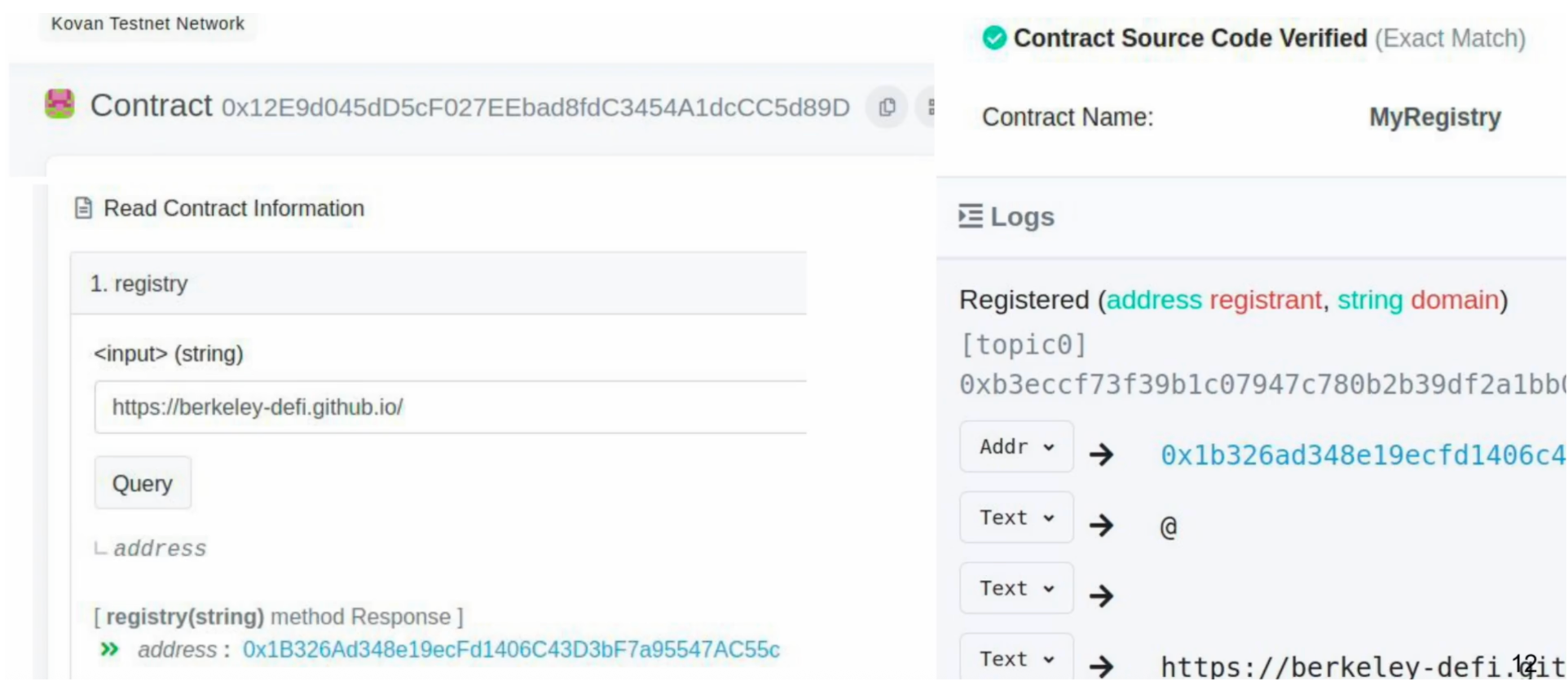 合约对象其实是储存在区块链上的,他有一个注册表 registerDomain的函数;如果有一个人想要去注册一个“defi.io”的域名,他就会在合约中去唤醒这个registerDomain函数,并且将字符串中的“defi.io”输入到对应的函数种;然后任何在区块链网络中人人都可以去注册表中查询选择这个“defi.io”的拥有者。