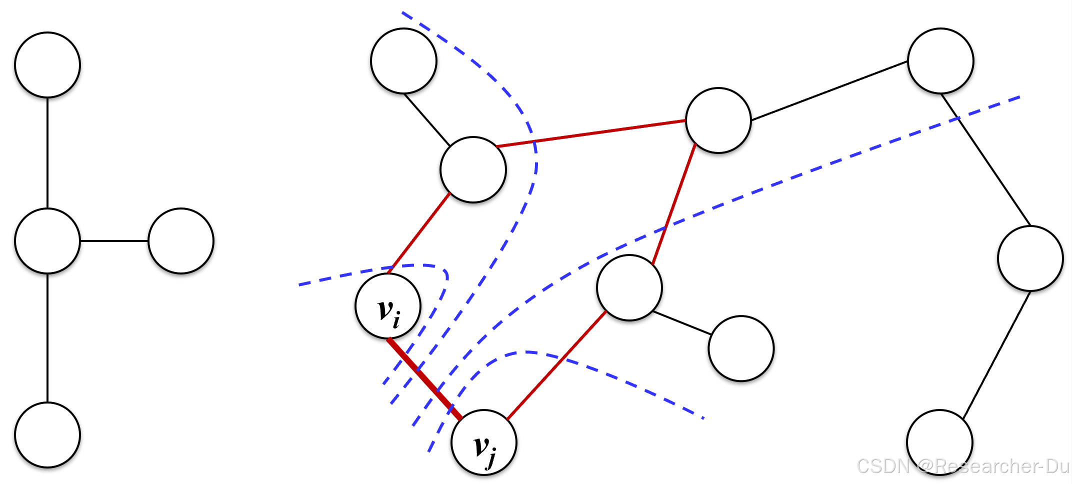 我们要将 e k = ( v i , v j ) e_k=(v_i,v_j) ek=(vi,vj) 构造为一个最短跨边,就要构造一个割,且这一割不经过别的更短的跨边(也就是不穿过那些已经在MST中的跨边)。为此,我么可以将那些已经在MST子树中的点缩点即可,这样割就不会穿过比 e k = ( v i , v j ) e_k=(v_i,v_j) ek=(vi,vj) 更短的跨边了。
