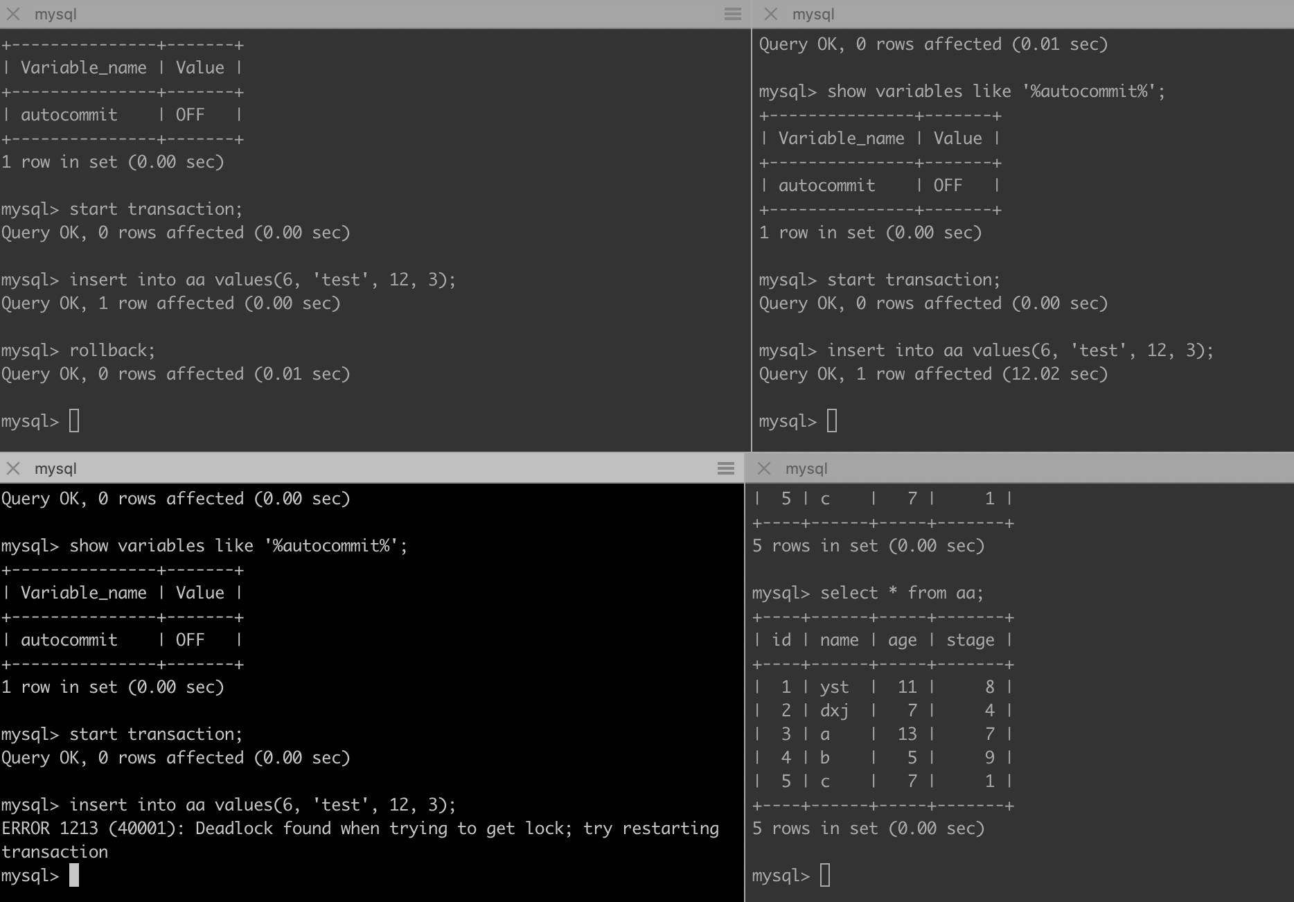 - ERROR 1213 (40001): Deadlock found when trying to get lock; try restarting transaction