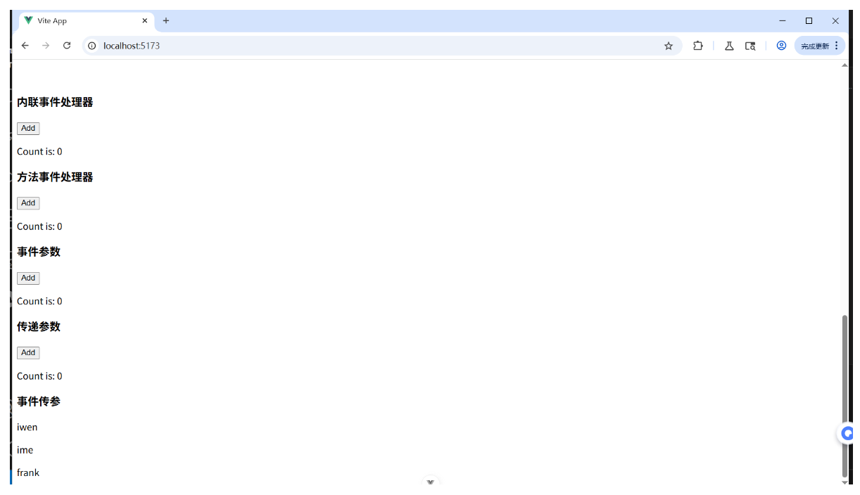 <template><h3>内联事件处理器</h3><button @click=count++>Add</button><p>Count is: {{ count }}</p>
