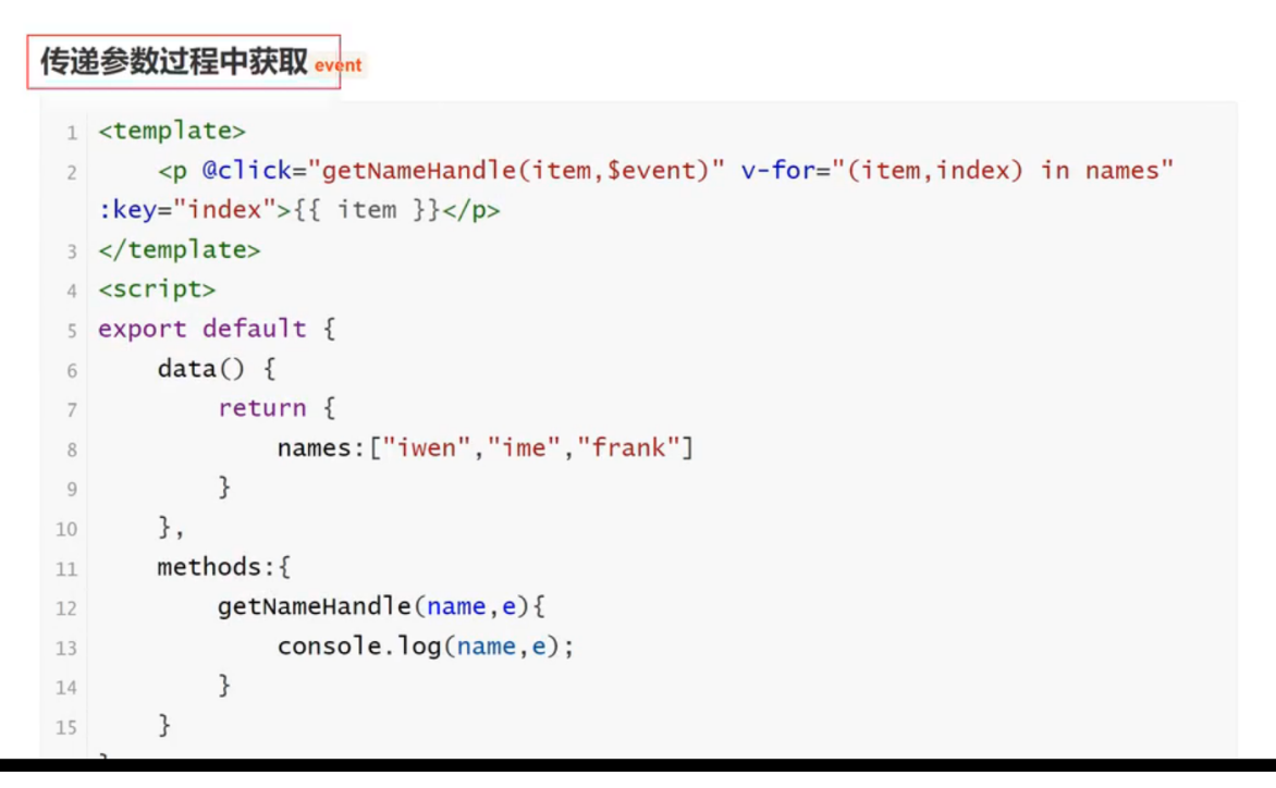 export default {data() {return {names:["iwen","ime","frank"]}},methods: {getNameHandler(name,e) {console.log(name,e)}}
