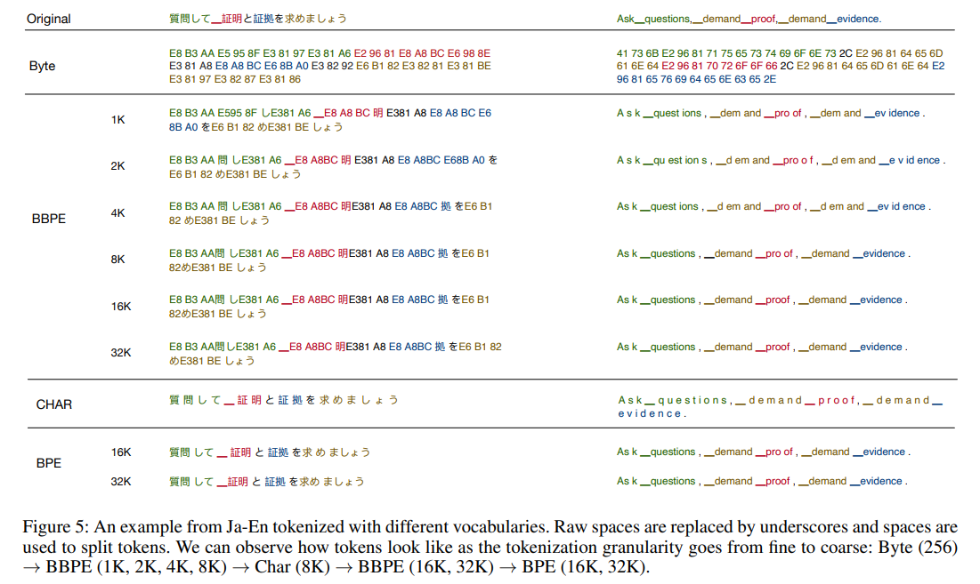 BBPE算法在基于字节(Byte)进行合并过程和BPE一致、也是选取出现频数最高的字符对进行合并,合并过程如下图所示: 关注到红色箭头,输入是日文当词表大小是1K时,A8 BC 两个字节并没有合并成一个 Token,在词表大小是2K时,A8BC被BBPE合并成一个Token。