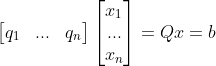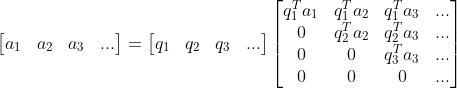 以上处理可以使用矩阵表示,矩阵 Q 为矩阵 A 的列进行线性变换结果,故可写为 A=QR 。