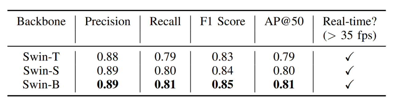 我们还研究了帧的空间分辨率及不同主干网络的影响,同时在表IV和表V中揭示了性能与吞吐量之间的权衡关系。值得注意的是,我们采用Swin-B主干网络的最高性能模型实现了超过35 FPS的优异帧率,而采用Swin-T主干网络的最高吞吐量模型则以显著优势超越了先前工作[13]。