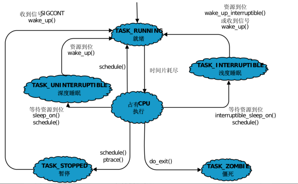 - 状态转换条件:运行态因时间片耗尽、等待事件(如 I/O)转为就绪 / 阻塞;就绪态获 CPU 调度转为运行;阻塞态等待事件完成转回就绪,清晰呈现状态切换的触发逻辑。