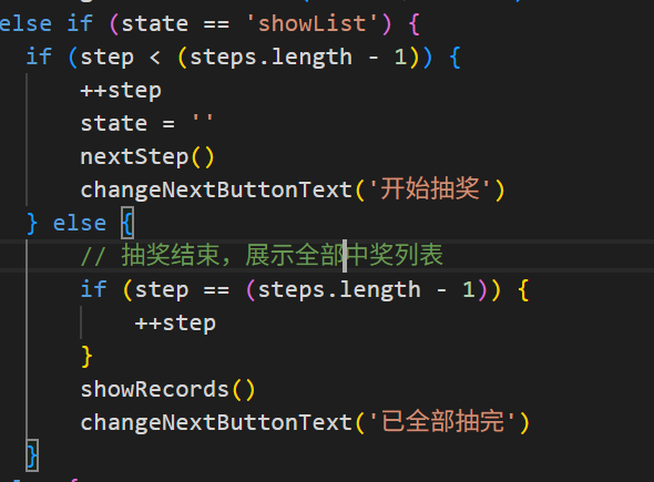 点击下一步,如果step小于奖品列表长度,将state设置为空,执行nextStep()函数,将按钮重置为开始抽奖。否则代表奖品已经抽完,执行showRecords()方法,改变按钮为已全部抽完。showRecords方法调用后端“winning-records/show”接口,展示中奖者信息。