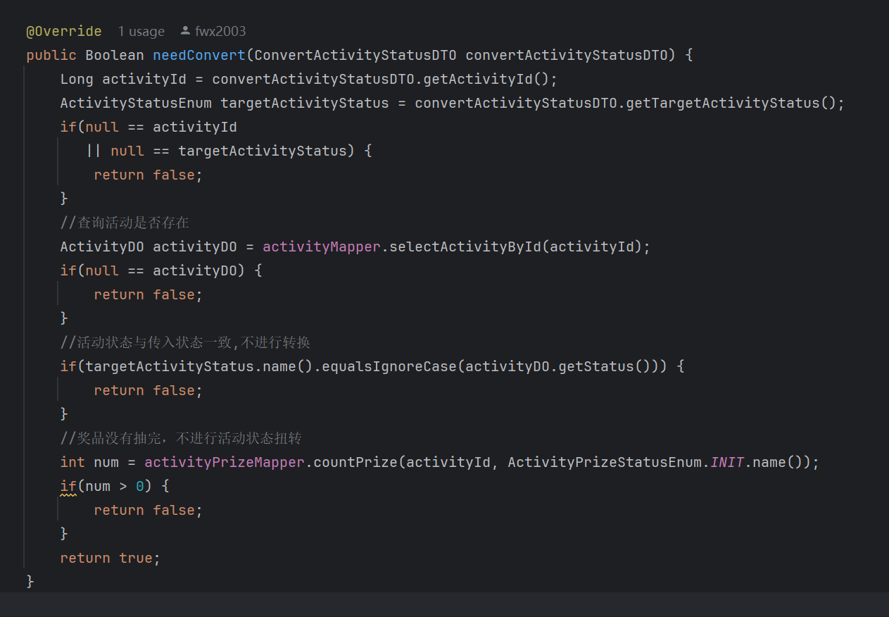 ConvertActivityStatusDTO类存放活动id,活动目标状态,奖品id,奖品目标状态,人员id,人员目标状态。将这些状态设置为目标状态,调用activityStatusManage服务,将需要扭转的状态进行扭转。