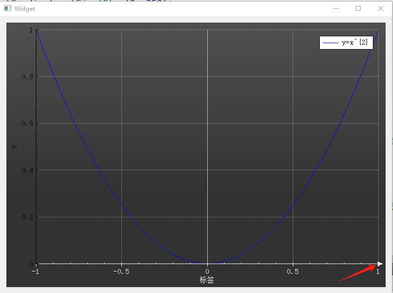 {QVector<double> x(101), y(101);for (int i = 0; i < x.size(); i++){x[i] = i / 50.0 - 1; // x从-1 到 1y[i] = x[i] * x[i]; // 二次函数}customPlot->addGraph(); // 添加一幅折线图customPlot->graph(0)->setData(x, y); // 为曲线图添加数据 注意这个方法只能是double类型 库内就是这样声明与定义的customPlot->graph(0)->setName("y=x^{2}");// 设置x与y坐标轴的范围customPlot->xAxis->setRange(-1, 1);customPlot->yAxis->setRange(0, 1);// 设置x与y坐标轴的标签customPlot->xAxis->setLabel("x");customPlot->yAxis->setLabel("y");// 显示图例customPlot->legend->setVisible(true);