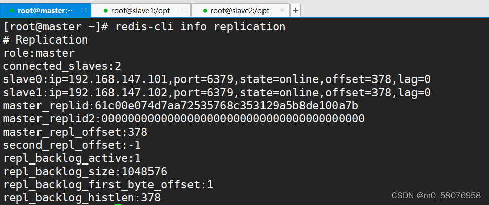 slave1:ip=192.168.147.102,port=6379,state=online,offset=378,lag=0