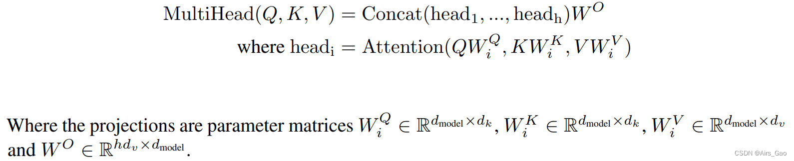 我们发现,与其使用d_model维度的keys, values 和 queries执行单一的注意力函数,不如将keys, values 和 queries分别以不同的、学习过的线性投影h次线性投影到dk、dk和dv维度,这是有益的。