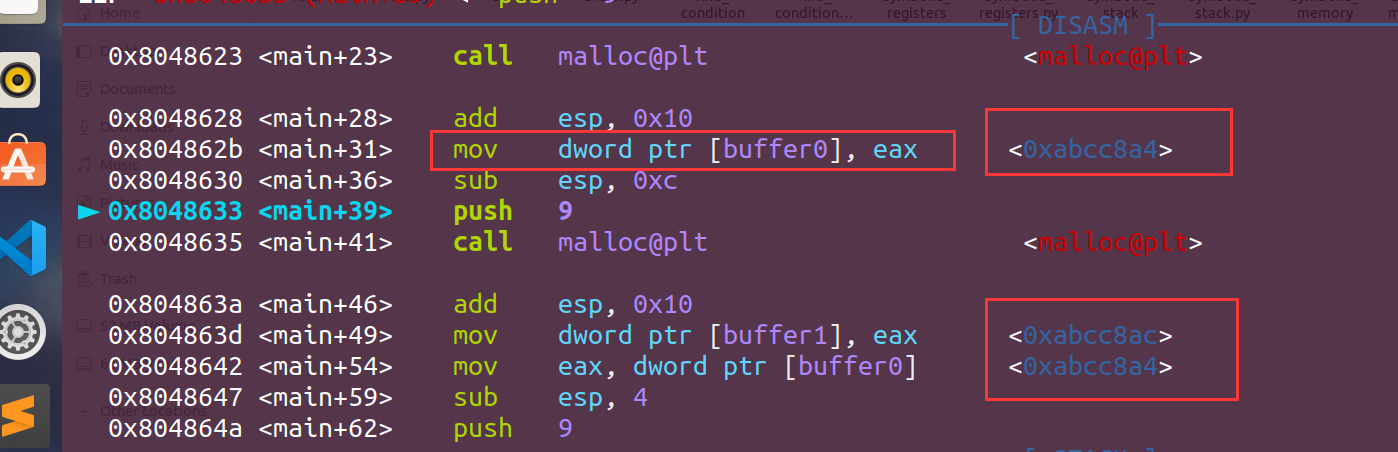 这里还是用到gdb来调试看看,首先我们大概了解了程序到底干了点啥,所以就是看看malloc后如何将指向分配的内存地址的指针存放在buffer0和buffer1这里