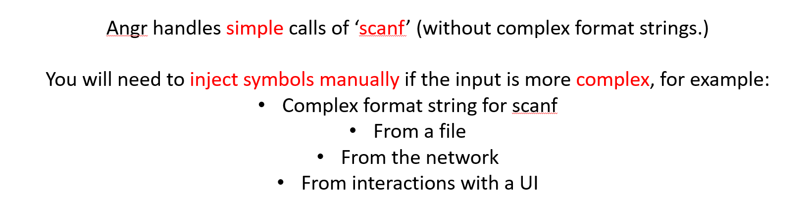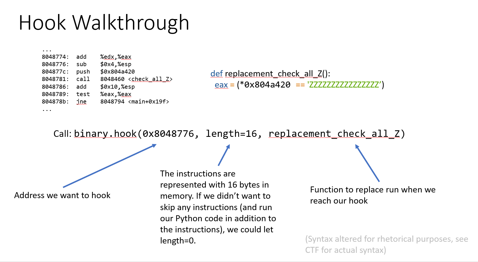 This challenge is similar to the previous one. It operates under the same premise that you will have to replace the check_equals_ function. In this case, however, check_equals_ is called so many times that it wouldn't make sense to hook where each one was called. Instead, use a SimProcedure to write your own check_equals_ implementation and then hook the check_equals_ symbol to replace all calls to scanf with a call to your SimProcedure. You may be thinking: Why can't I just use hooks? The function is called many times, but if I hook the address of the function itself (rather than the addresses where it is called), I can replace its behavior everywhere. Furthermore, I can get the parameters by reading them off the stack (with memory.load(regs.esp + xx)), and return a value by simply setting eax! Since I know the length of the function in bytes, I can return from the hook just before the 'ret' instruction is called, which will allow the program to jump back to where it was before it called my hook. If you thought that, then congratulations! You have just invented the idea of SimProcedures! Instead of doing all of that by hand, you can let the already- implemented SimProcedures do the boring work for you so that you can focus on writing a replacement function in a Pythonic way. As a bonus, SimProcedures allow you to specify custom calling conventions, but unfortunately it is not covered in this CTF.
