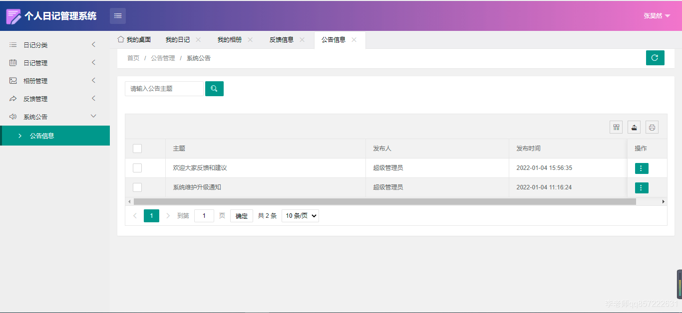 项目介绍: 使用javaspringbootmysql开发的个人日记管理系统,系统包含超级管理员、管理员、用户角色,功能如下: 超级管理员:管理员管理;用户管理;反馈管理;系统公告;个人…...