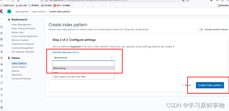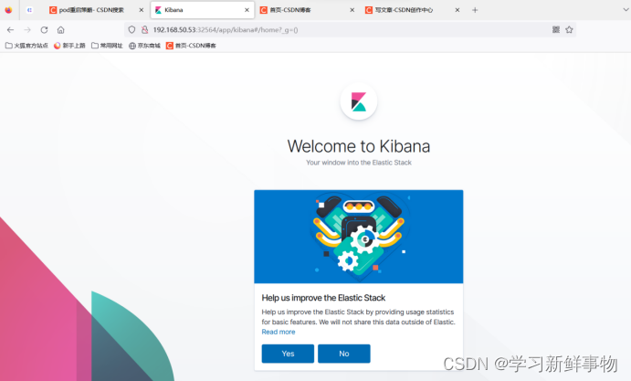 通过访问 192.168.50.53:32564 进入到 kibana 的访问界面,观察是否可以正常打开,其中 32564端口需要替换成实际的端口号。若能正常访问,说明 Kibana 连接 es 已经正常。