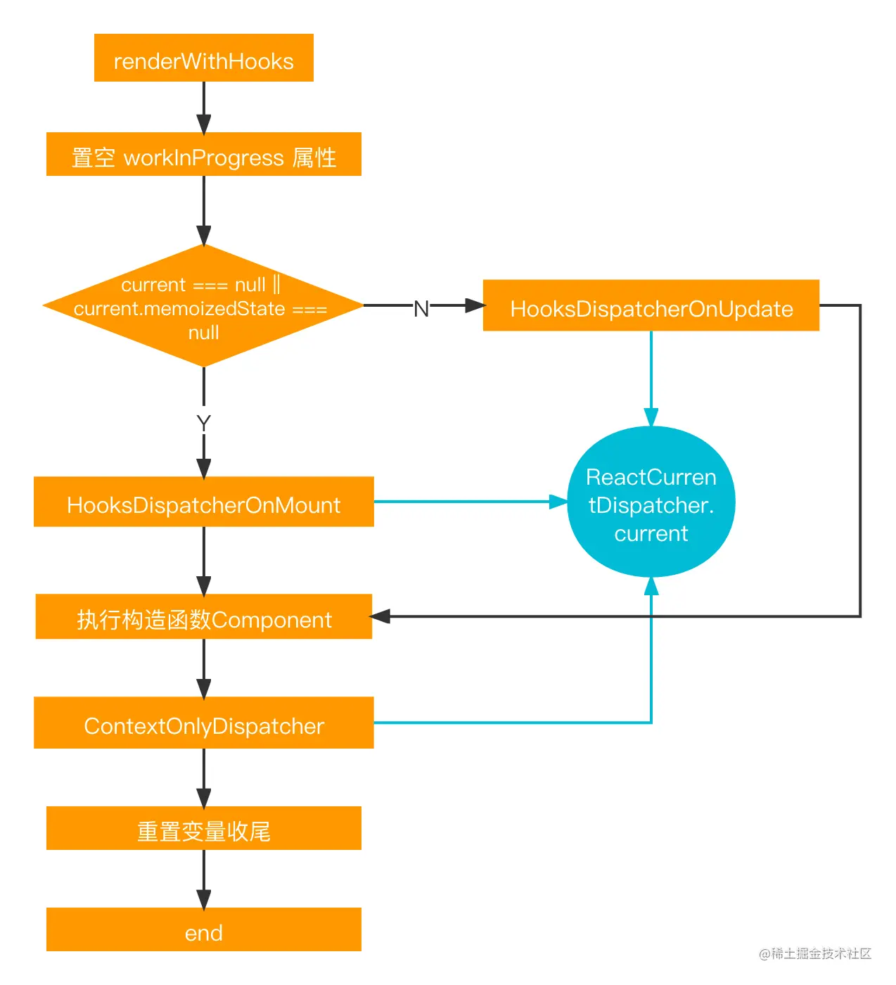 然后会通过 current 上是否有 memoizedState,判断组件是否首次渲染,从而分别将 HooksDispatcherOnMount 和 HooksDispatcherOnUpdate 赋值给 ReactCurrentDispatcher.current。