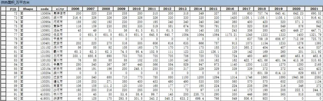 我们先来看一下Excel格式的数据,地级市和县级市的2006—2021年供热面积汇总为一个Excel文件,我们来预览一下: