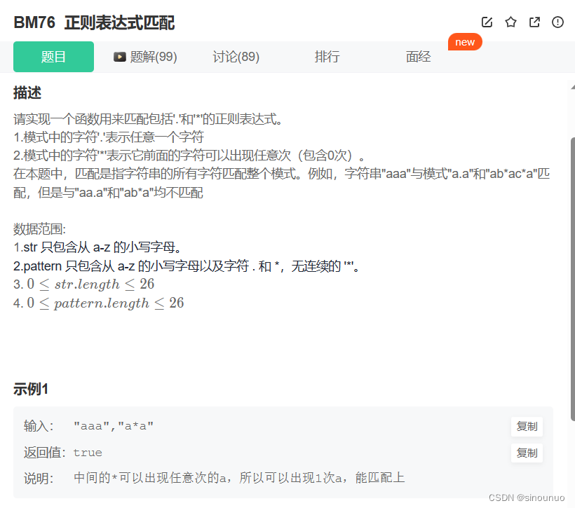 思路:首先进行长度异常判断,如果没有模式长度,那字符串长度也应该为空。然后开始匹配字符串和模式的第一位first_match。然后递归匹配之后的情况,如果第二位出现了*,那第一位不匹配也没有关系,匹配(s,pattern[2:]),如果第一位匹配,就匹配之后的(s[1:],pattern)。