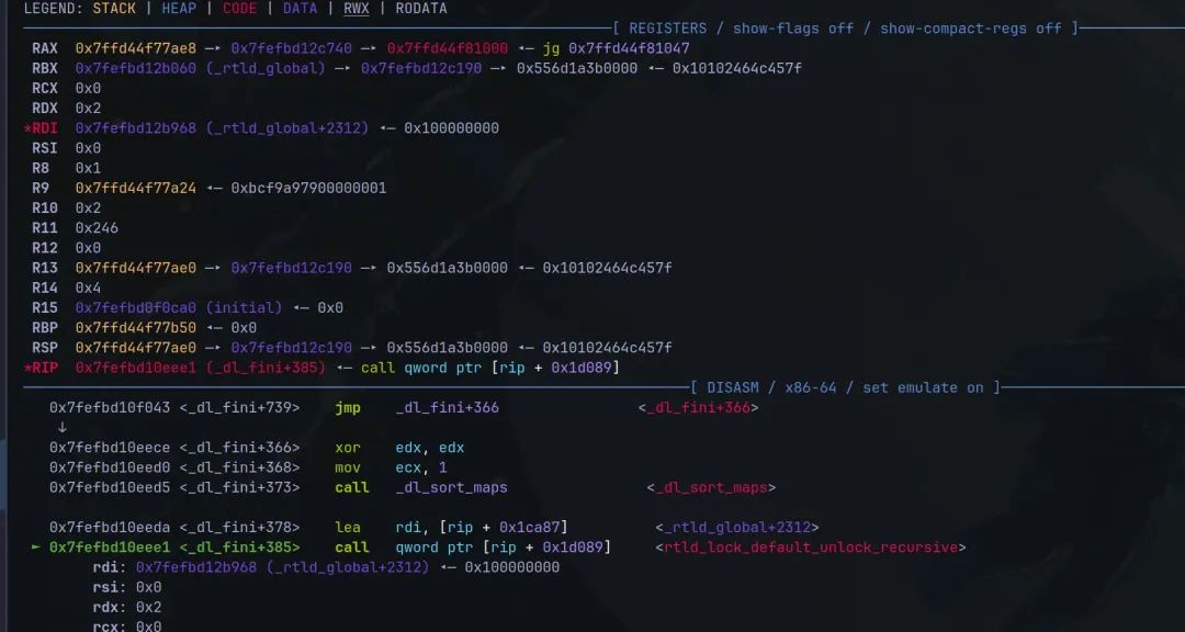 执行p _rtld_global。看到那两个rtld_lock_default_lock_recursive和rtld_lock_default_unlock_recursive吗,就是他们两个。我们可以修改他们的内容,从而作为exithook进行调用(直接call)。把后面的东西复制过来p &xxx就可以查看其地址了。