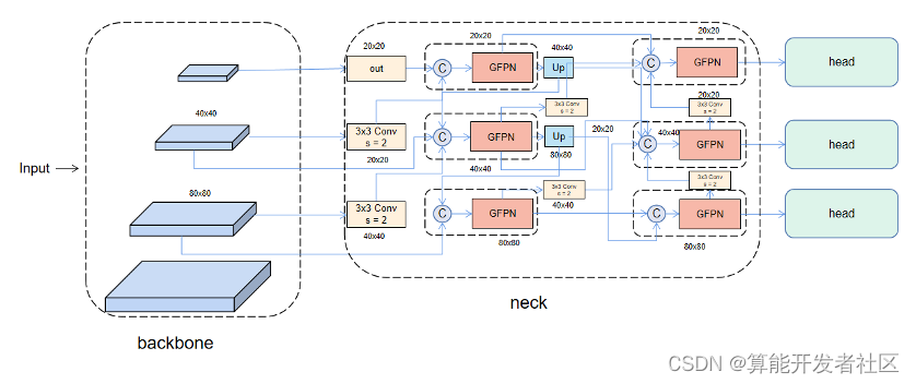 DAMO-YOLO是2022年阿里达摩院提出的YOLO系列的算法改进工作,其中比较有意思的一点就是他们针对于YOLO的neck改进的RepGFPN。最初的想法是GFPN,作者认为GFPN有效的主要原因之一是因为它可以充分交换高级语义信息和低级空间信息。在GFPN中,多尺度特征在前一层和当前层的层次特征中都被融合。更重要的是,log2(n)跳过层连接提供了更有效的信息传输,可以扩展到更深层次的网络。他们发现在现代yolo系列模型上用GFPN直接替换原先的Neck结构后,可以获得了更高的精度。问题在于基于GFPN的模型的延迟远远高于基于改进的panet的模型,所以精度的提升或许有些得不偿失。然后提出一种新颖的高效—RepGFPN来满足实时目标检测的设计。
