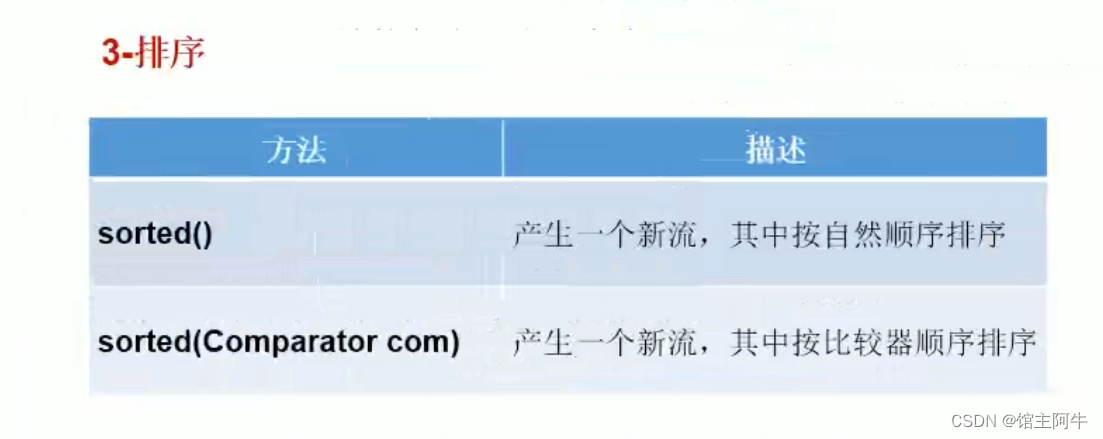 List<String> list = Arrays.asList("阿牛", "小牛", "大牛", "小红");Stream<String> stream1 = list.stream();// limit(n) -- 截断流,使其元素不超过给定数量stream1.limit(2).forEach(System.out::println);System.out.println("----------");Stream<String> stream2 = list.stream();// skip(n) -- 跳过元素,返回一个人扔掉前n个元素的流,若流中元素不足n个,则返回一个空流stream2.skip(3).forEach(System.out::println);System.out.println("----------");List<String> list1 = Arrays.asList("阿牛", "小牛", "大牛", "小红","阿牛"); // 添加一个重复元素Stream<String> stream3 = list.stream();// distinct() -- 筛选,通过流所生成元素的hashcode()和equals()去除重复元素stream3.distinct().forEach(System.out::println);