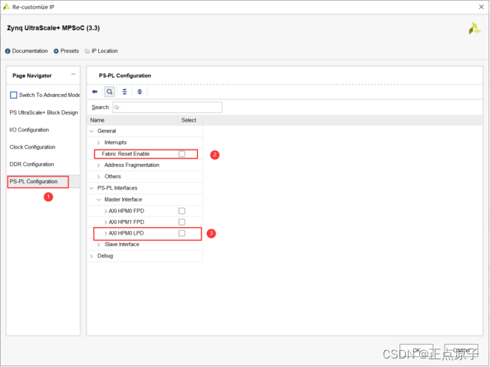如上图所示我们把Fabric Reset Enable(PS端产生的复位信号给PL端使用)和AXI HPM0 LPD选项给去掉,因为本节实验只用到了PS部分,没用到PL部分。